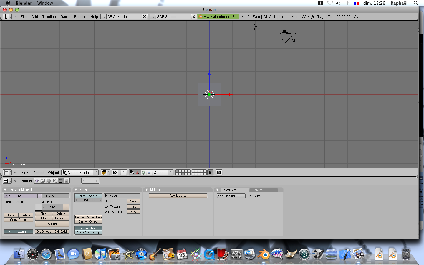 Vous avez normalement un cube, une lampe, et une camera, le tout en vue de haut. Mettez vous en vue de face (1 du pavé numérique), et sélectionnez votre cube.