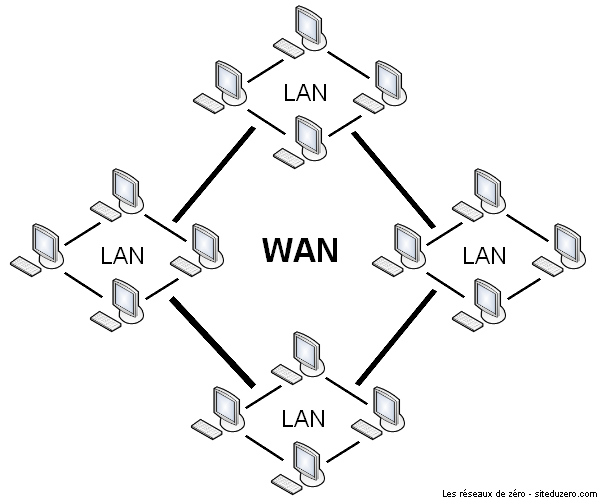 WAN signifie Wide Area Network, en français, on peut le traduire par "réseau étendu". Un WAN est en fait une association de plusieurs LAN. Supposons 3 LAN formés par des switchs : le "branchement" des 3 switchs sur un autre switch forme un WAN, car on associe plusieurs LAN entre eux. Nous pourrons l'utiliser pour obtenir un seul réseau virtuel dans deux endroits géographiques différents. Cet exemple peut être contesté, car on parle plus souvent de WAN pour des réseaux très grands, à échelle régionale voire nationale, mais l'idée est là.