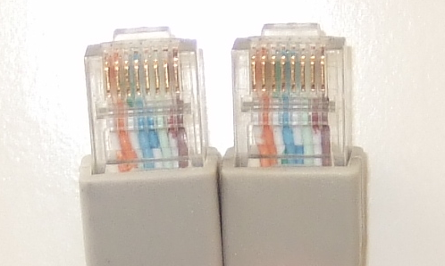 Sur cette photo, on voit que les couleurs des fils à l'intérieur des embouts sont dans le même ordre sur les deux connecteurs : c'est donc un câble droit. Si le premier fil en partant de la gauche est inversé avec le 3ème et que le 2ème est inversé avec le 6ème, c'est un câble croisé. Sinon, c'est un câble dit "bâtard", mais c'est rare. Ce type de câble est parfois appelé "câble RJ-45" : c'est un abus de langage, RJ-45 est le nom de l'interface du câble (en gros, son embout).