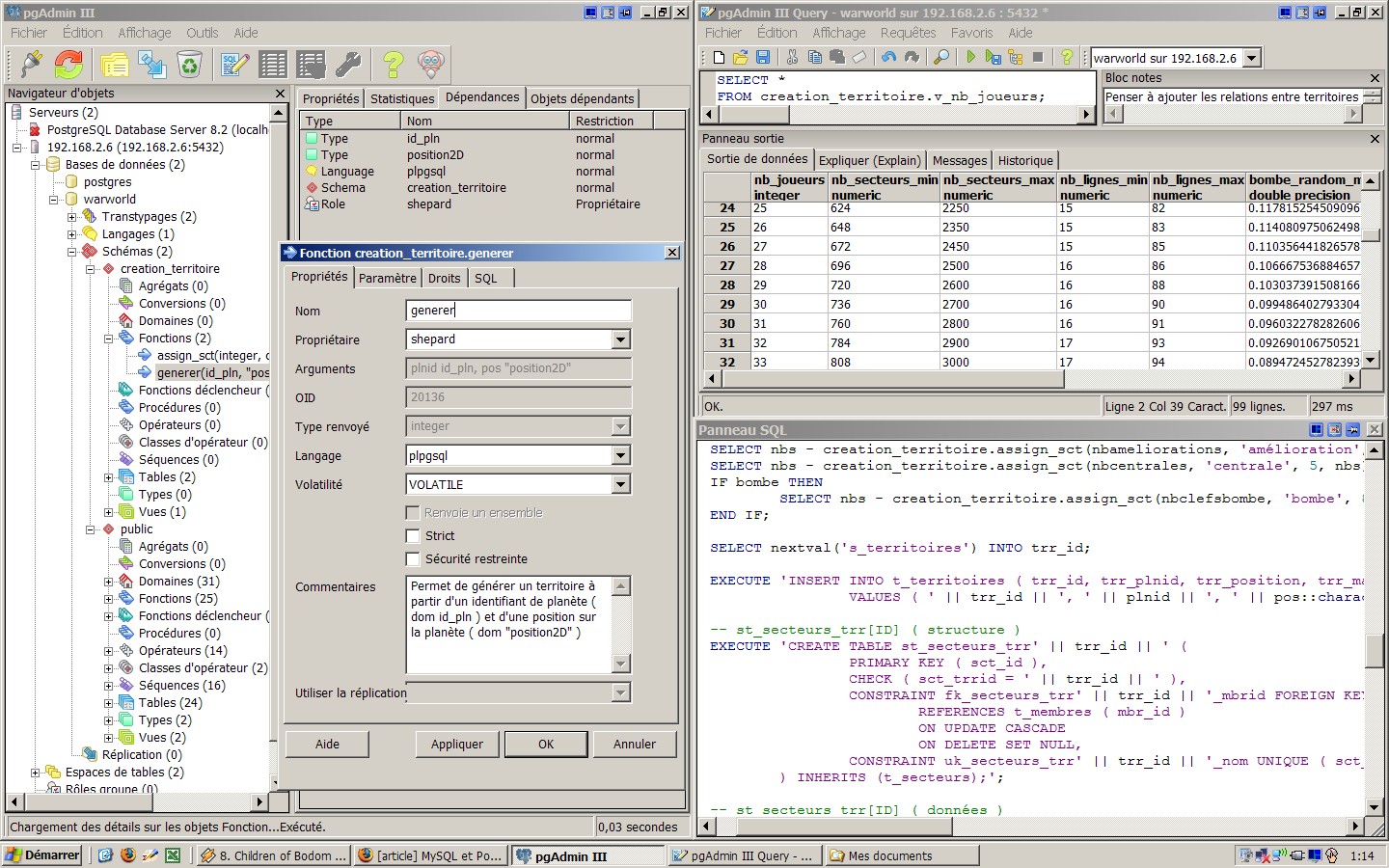 Du côté de l'utilisation, alors que MySQL est pratiquement directement utilisable en production (il n'y a pas 36 paramètres à modifier), PostGreSQL est proprement inutilisable en production si on ne regarde pas du côté des fichiers de configuration. Il requiert donc un minimum de lecture si on installe le serveur soi-même. Par contre si vous l'installez sur votre pc juste pour faire des tests en local, un enfant de 10 ans n'aurait pas de difficultés à créer une table. En effet PostGreSQL est livré avec un outil "PgAdmin III" vraiment très bien conçu. Évidemment MySQL aussi propose des outils de ce genre mais il faut chercher un peu avant d'en trouver un bon. Personnellement je trouve que ceux qui sont proposés par MySQL n'ont rien d'extraordinaire, mais je suis subjectif sur ce point. Je vous laisse tester "MySQL Administrator" et "MySQL Query Browser". :)