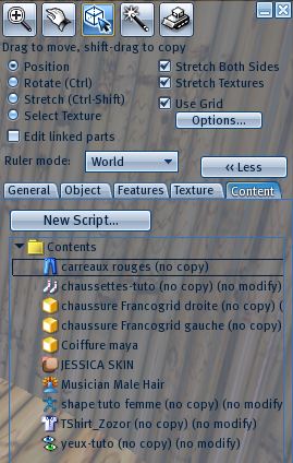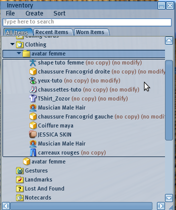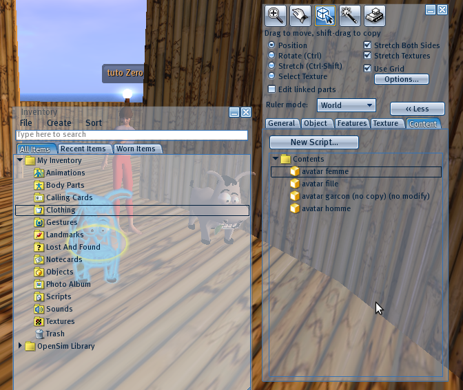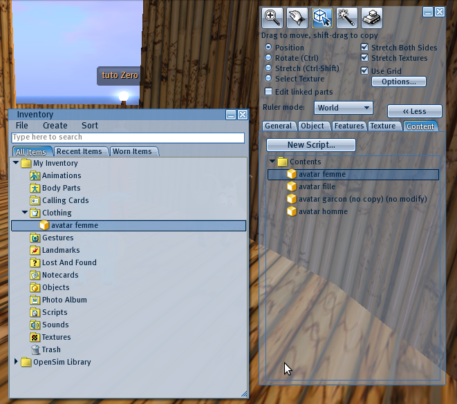 l’inventaire de l’OpenSim (OpenSim library), ensemble d’items proposés à l’installation du logiciel ;