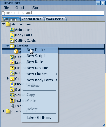 Dans l’OpenSim, votre avatar — donc vous-même — possède un inventaire d’items divers et variés. Où que vous soyez, chez vous, sur une autre région ou dans l’hypergrid, vous emportez avec vous cet inventaire, et s’il n’y a pas de bug, vous pourrez l’utiliser. L’image ci-contre représente le menu « Inventory » dans un navigateur. Pour ouvrir l’inventaire, cliquez sur le bouton « Inventory » à droite de la barre de boutons en bas de l’écran.