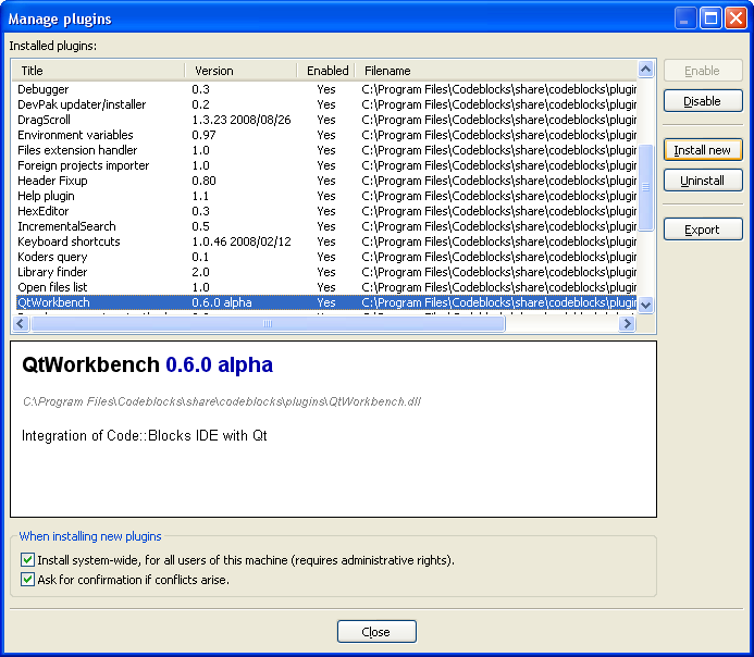 Si vous souhaitez utiliser uniquement Code::Blocks pour développer et compiler un programme utilisant la bibliothèque Qt (signaux et slots personnalisés compris), ce tutoriel est fait pour vous ! Celui-ci vous apprendra à installer et configurer le plugin QtWorkbench, et vous expliquera comment configurer un nouveau projet utilisant ce plugin.