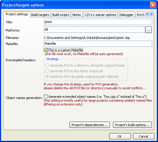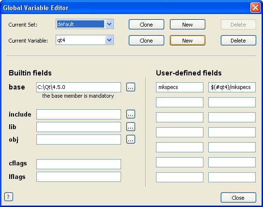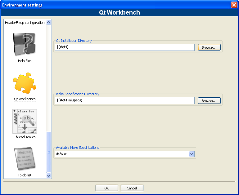 Dans la boîte de dialogue Qt Installation Directory, indiquez $(#qt4). Dans la boîte de dialogue Make Specifications Directory, indiquez $(#qt4.mkspecs). La dernière option vous permet de sélectionner le compilateur de votre choix. Il est recommandé de laisser default. Validez en appuyant sur OK.