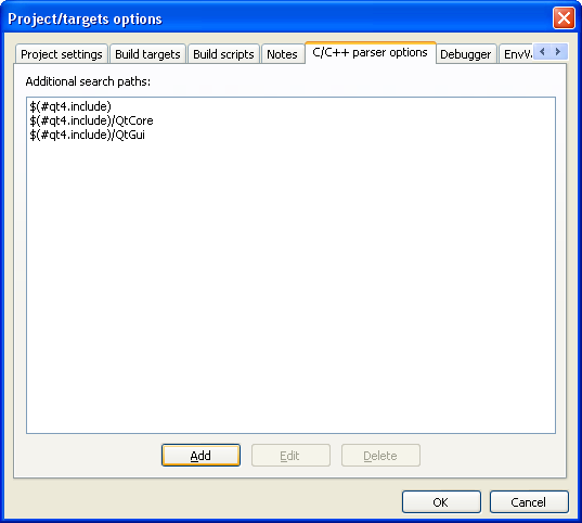 Dans l'onglet C/C++ parser options, ajoutez les cibles des différents modules Qt que vous souhaitez utiliser dans votre projet, sans oublier d'utiliser la variable globale de Qt !