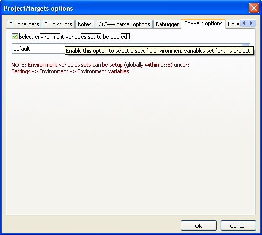 Dans l'onglet EnvVars options, cochez Select environment variables set to be applied et sélectionnez la variable d'environnement dans laquelle est enregistrée la variable globale de Qt. Par défaut, cela devrait être default.