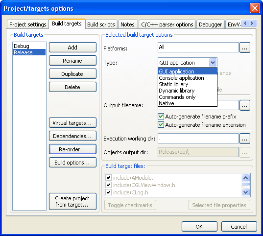 Bien sûr, pour la cible de construction Debug, il vous faudra cocher Debug et Console (Si vous voulez la console) au lieu de Release.