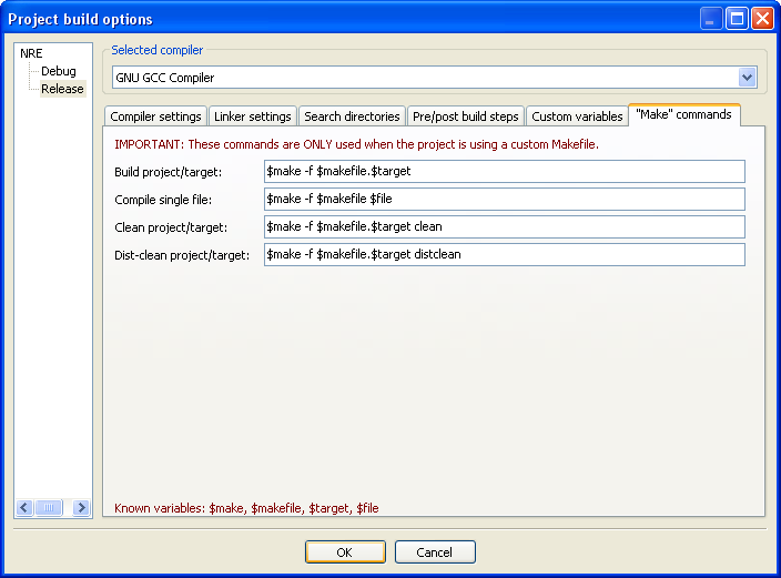 Dans ce même onglet Build targets, vérifiez que la cible de construction Release est toujours sélectionnée et cliquez sur le bouton Build options. Dans la nouvelle fenêtre qui s'affiche, allez dans l'onglet "Make" Commands. Changez les valeurs des champs par les suivantes : - Build project/target : $make -f $makefile.$target - Compile single file : $make -f $makefile $file - Clean project/target : $make -f $makefile.$target clean - Dist-clean project/target : $make -f $makefile.$target distclean