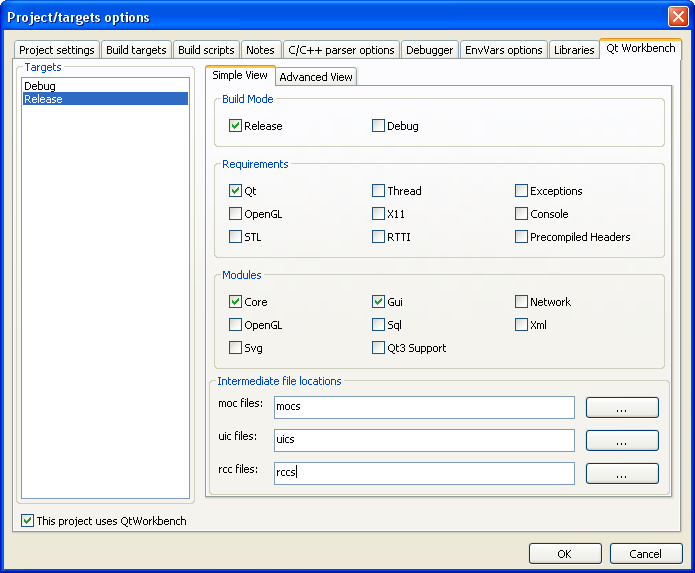 Cochez les options Release, Qt, Core et Gui. Vous devrez bien sûr adapter ces options en fonction de votre projet (je pense notamment à cocher Debug lorsque vous configurerez les options de cette cible). Il reste 3 champs à configurer : - Pour le champ moc files, indiquez mocs. - Pour le champ uic files, indiquez uics. - Pour le champ rcc files, indiquez rccs.