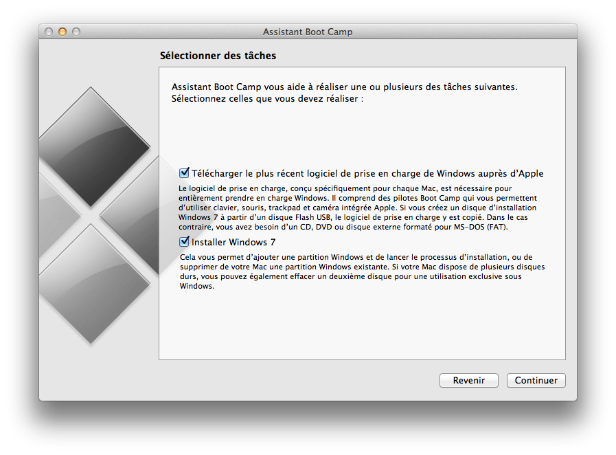 Avant de rebooter pour installer Windows, mettez à jour votre système (menu Pomme > Mise à jour de logiciels…) afin de posséder la dernière version des pilotes qui seront à installer sous Windows. Lancez l'Assistant Boot Camp et sélectionnez le téléchargement de la prise en charge de Windows auprès d'Apple ainsi que "Installer Windows 7" qui paramètrera tout ce qu'il faut pour pouvoir installer Windows, sur l'étape suivante définissez la taille de votre partition Windows, pour ma part j'y affecterait 40Go ce qui laissera ensuite environ 25 à 30Go d'espace libre une fois Windows installé. Il vous faudra à ce moment là, votre DVD d'installation inséré dans votre lecteur. Le système ajoutera une partition pour windows et redémarrera en bootant tout seul sur votre DVD.