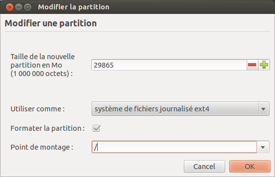 Sélectionnez la partition sur laquelle est installée Mac OS ("Macintosh HD" pour ma part) puis ajoutez en une (le petit plus situé en dessous à gauche du graphique représentant votre disque dur). Là vous pouvez à nouveau nommer votre partition et la dimensionner comme vous le souhaitez. Mettez 30Go pour avoir un espace libre de 20 à 25Go une fois Ubuntu installé.