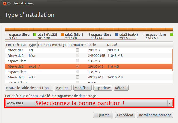 Je vous laisse choisir vos options d'installation au niveau des mises à jour et des logiciels tiers. Lorsqu'il vous est demandé de quelle manière installer Ubuntu, choississez "Autre chose". Vous avez ensuite la présentation de votre table des partitions, prenez le temps de bien annalyser les informations pour choisir la bonne partition si vous vous trompez il vous faudra certainement recommencer depuis le début. Il s'agit d'une partition de type hsf+ (celle de plus petite taille si vous avez utilisé les mêmes tailles que moi).
