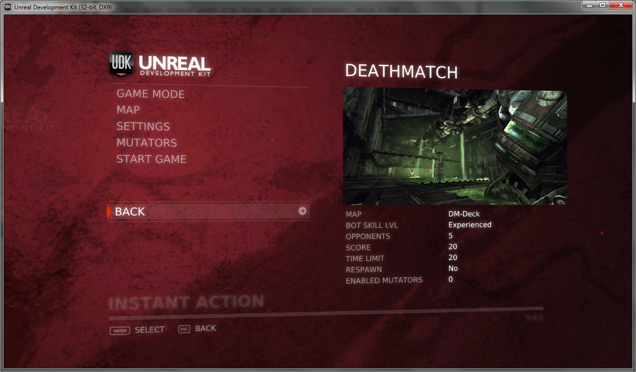 On commence par ce qui va vous faire rêver : les démos d'UDK ! Vous devriez maintenant disposer d'un raccourci UDK Game dans le menu Démarrer. Cliquez dessus, et attendez le lancement du jeu... Normalement ce dernier se lance avec une interface minimaliste, et quelques options. Cliquez sur Instant Action pour lancer rapidement une map en solo.
