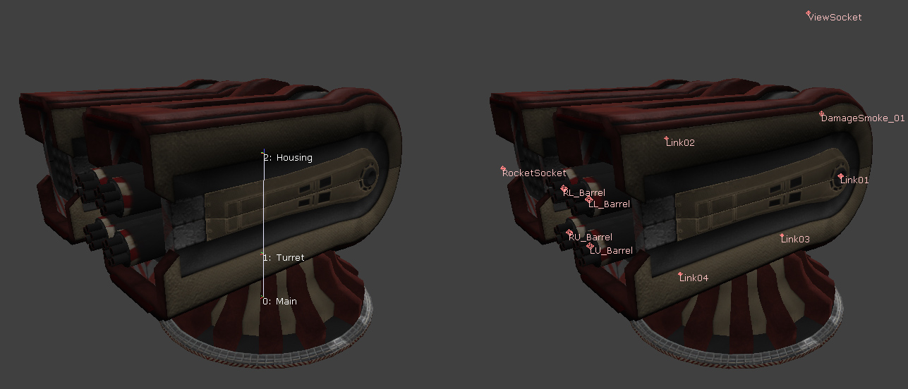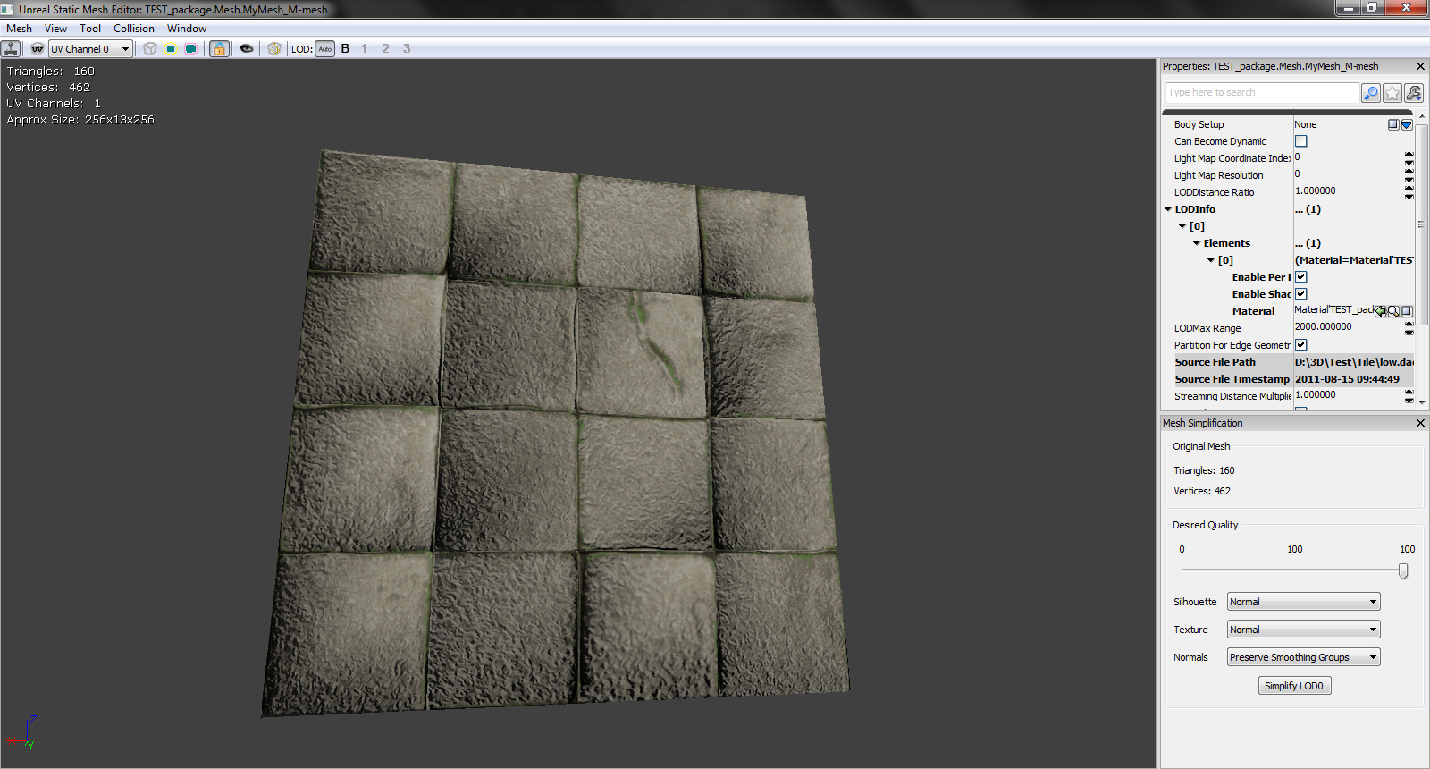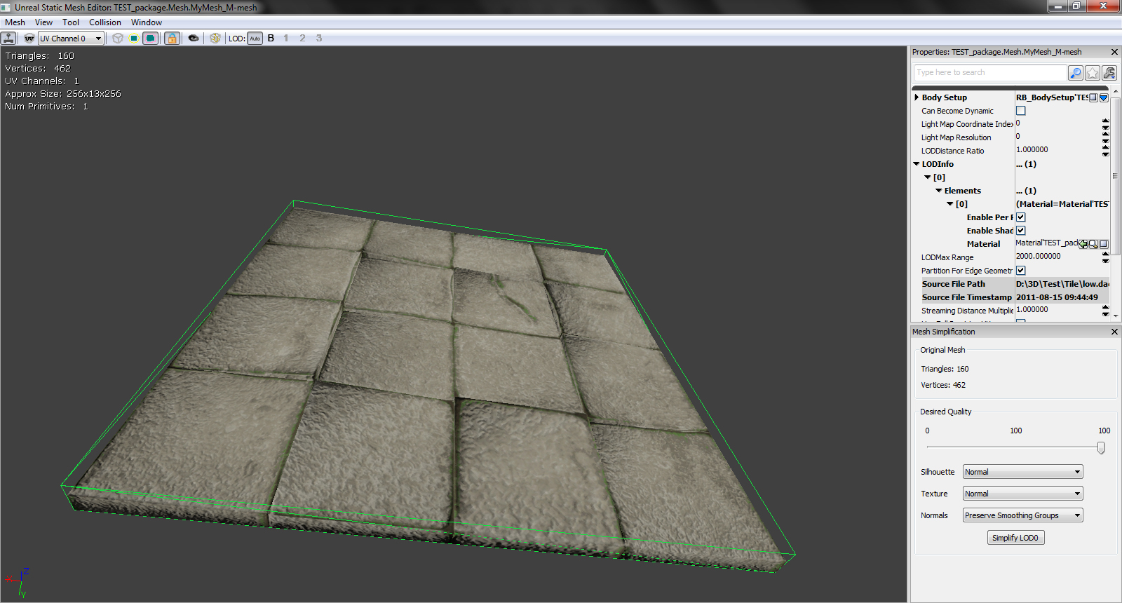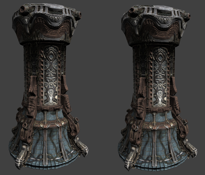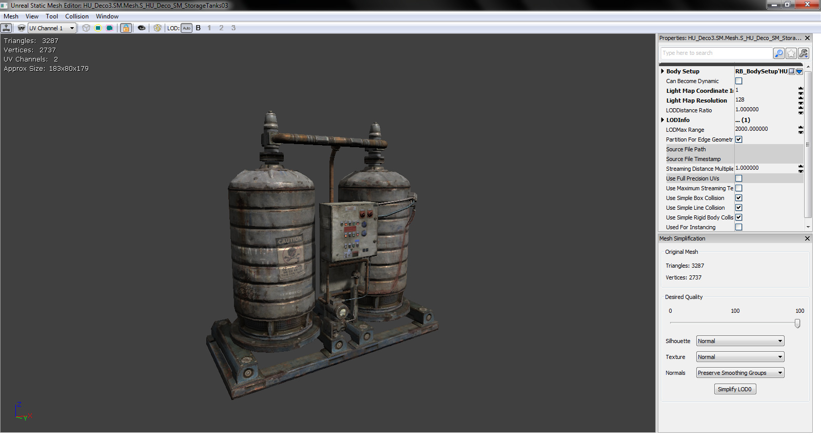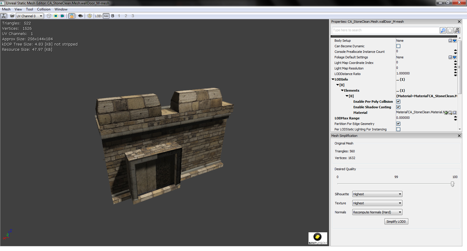 Les décors sont exclusivement constitués de StaticMesh : réalisés dans un éditeur externe, ils sont ensuite simplifiés via Simplygon, comme l'enseigne l'annexe précédente. La plupart des éléments de décor ne pèsent donc que quelques centaines de triangles, là où le mesh d'origine peut afficher plus de 10 000 polygones au compteur !