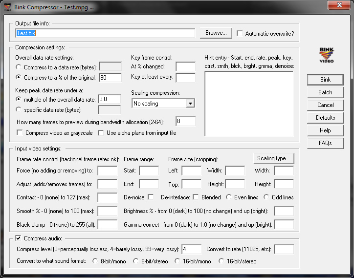 Toutes ces options permettent énormément de contrôle sur la vidéo émise en sortie. Vous pouvez en faire une vraie bouillie de pixels autant qu'une vidéo non dégradée de 3Go... :-° Une fois vos choix terminés, il suffit de cliquer sur le bouton Bink qui générera la vidéo compressée. Vous êtes prêts à utiliser la vidéo ! Dans mon exemple, j'ai gagné uniquement 25% en taille, parce que ma vidéo était déjà compressée efficacement. Sur une vidéo brute, le ratio peut être gigantesque.