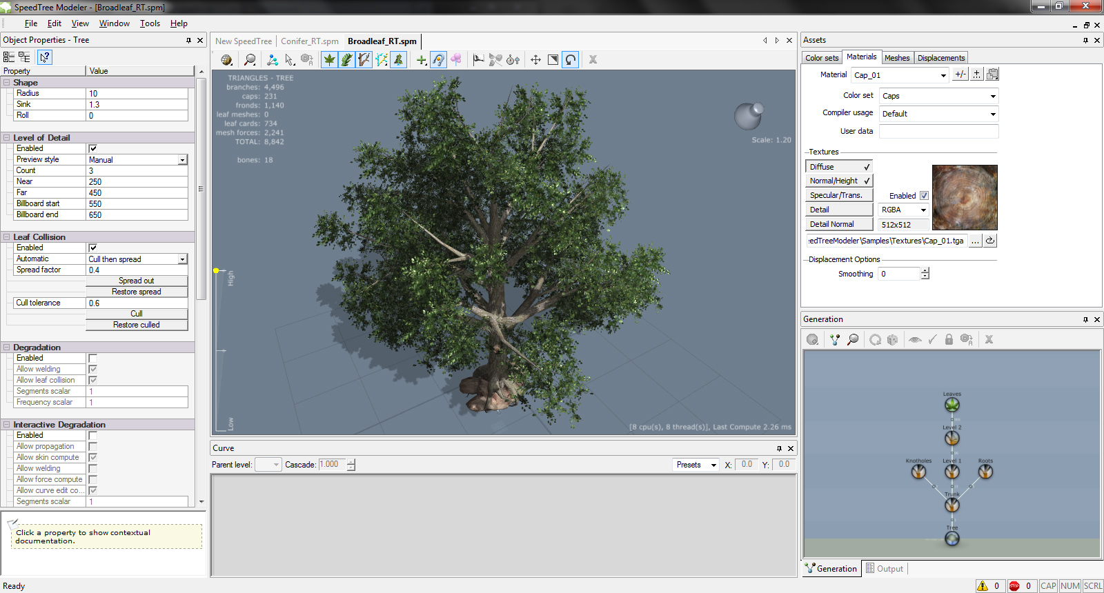 L'usage de SpeedTree ne fait pas l'objet de ce cours. De nombreuses vidéos de démonstration existent, nous allons ici nous contenter de tester un des arbres de démonstration. Une fois que vous êtes satisfait de votre arbre, vous pouvez passer à l'importation. :p