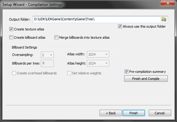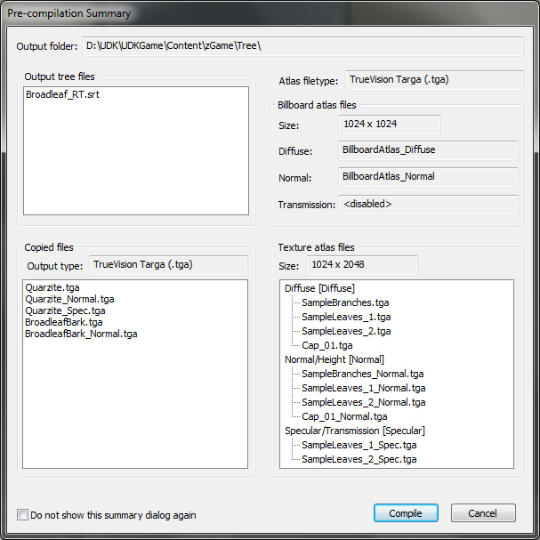 Avant tout, vous devez compiler votre SpeedTree. Ce processus est très simple, il suffit de lancer SpeedTree Compiler UDK que vous trouverez dans le dossier Binaries/SpeedTreeModeler d'UDK.