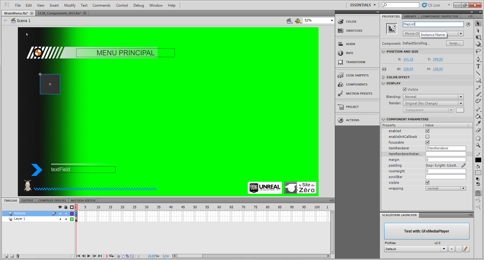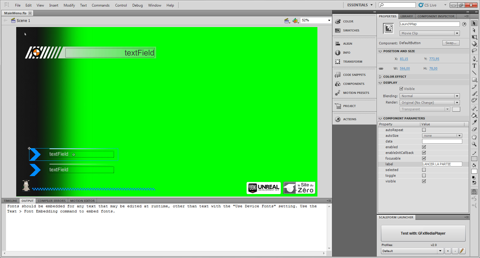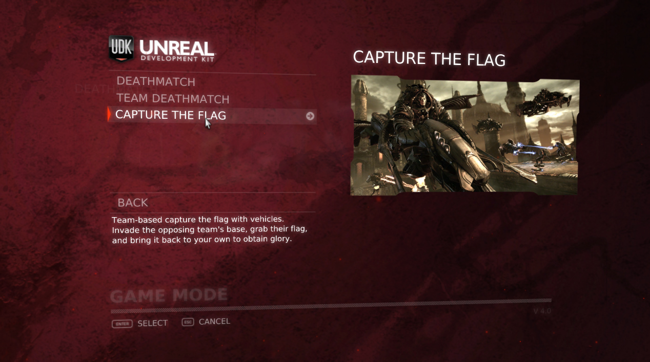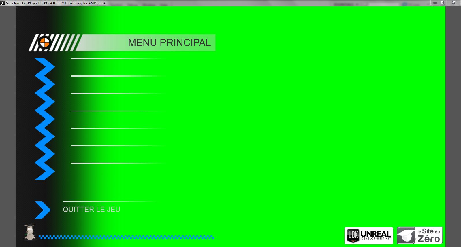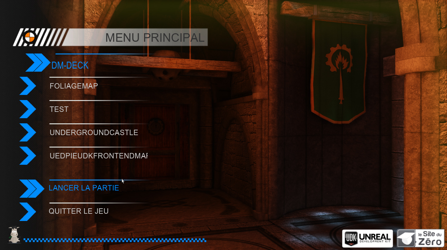 L'ensemble de l'interface 2D a été réalisée avec Scaleform. C'est à peu de choses près une simple amélioration du menu présenté dans ce cours, pour afficher avant de lancer la map une description de cette dernière. Les descriptions sont stockées, vous vous en doutez peut-être, dans un fichier INI.