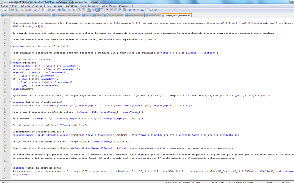 Comme dit ci-dessus, vous pouvez choisir de ne pas utiliser d'éditeur LaTeX et d’employer à la place un éditeur de type Bloc-notes, ou de faire usage d’outils de coloration de texte plus évolués. Les éditeurs LaTeX colorent le code (ce qui le rend beaucoup plus lisible) et vous permettent, via des raccourcis et des fenêtres vous informant des bugs, de faciliter la production de documents. De la figure suivante à la figure suivante, vous pouvez voir le même code, tapé respectivement dans un éditeur de texte simple (Bloc-notes), dans un éditeur de texte avec coloration (Notepad++, avec lequel les habitués de la programmation web auront sûrement beaucoup d'affinités) et pour finir, dans un éditeur LaTeX (TeXnicCenter).