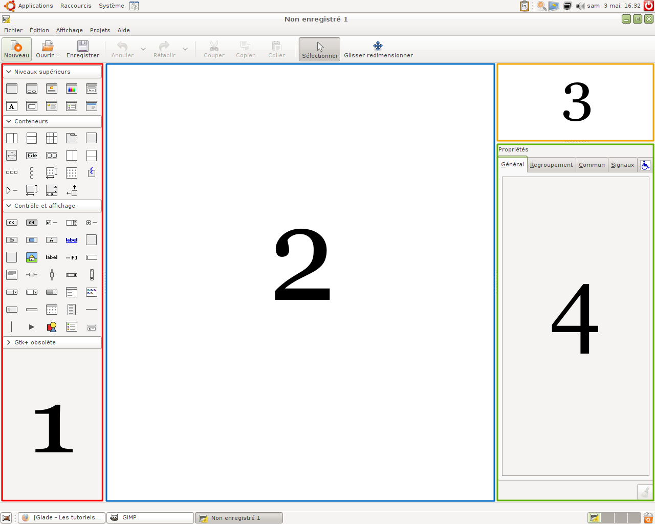 Dans notre cas, c'est-à-dire celui de débutants voulant commencer un tout petit projet, c'est le 3e point qui va nous intéresser. Le "Concepteur d'Interface Glade" va nous être d'une aide très précieuse pour nous initier à GTK. Il est vite pris en main et permet de créer en un rien de temps une interface graphique.
