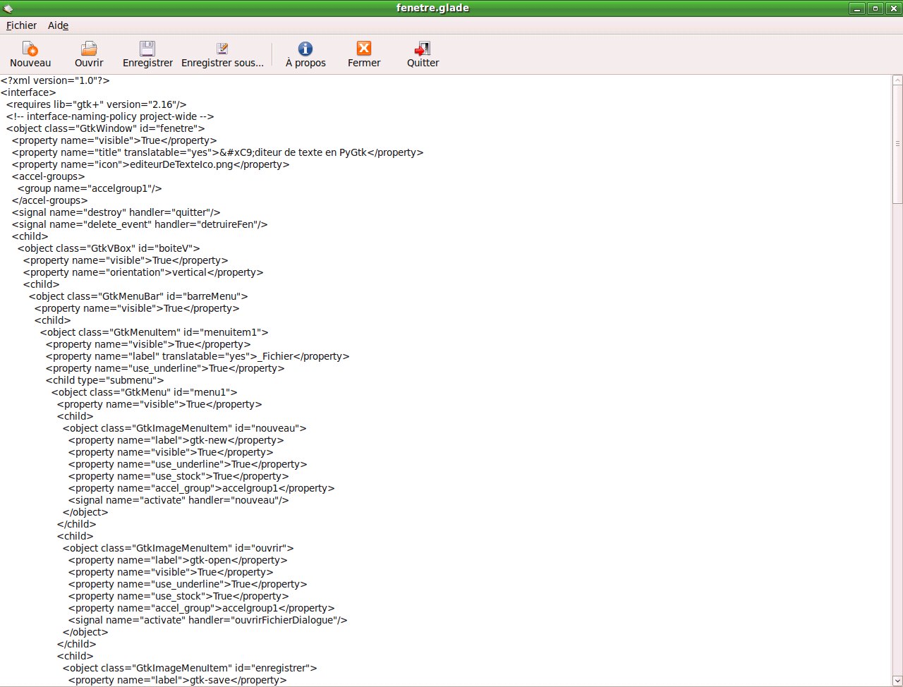 Les plus futés d'entre vous reconnaîtrons un fichier XML. Si on y regarde de près, on y retrouve la hiérarchie de nos widgets. Et je dirai même qu'on n'y retrouve que ça. C'est-à-dire qu'il n'y a pas de code pour exécuter notre interface. Ce code-la, c'est nous qui devrons l'écrire avec nos petites menottes.